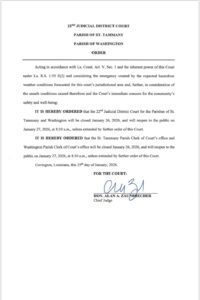 Pursuant to the attached court order, all offices of the St. Tammany Parish Clerk of Court will be closed on Monday, January 26, due to anticipated winter weather conditions.